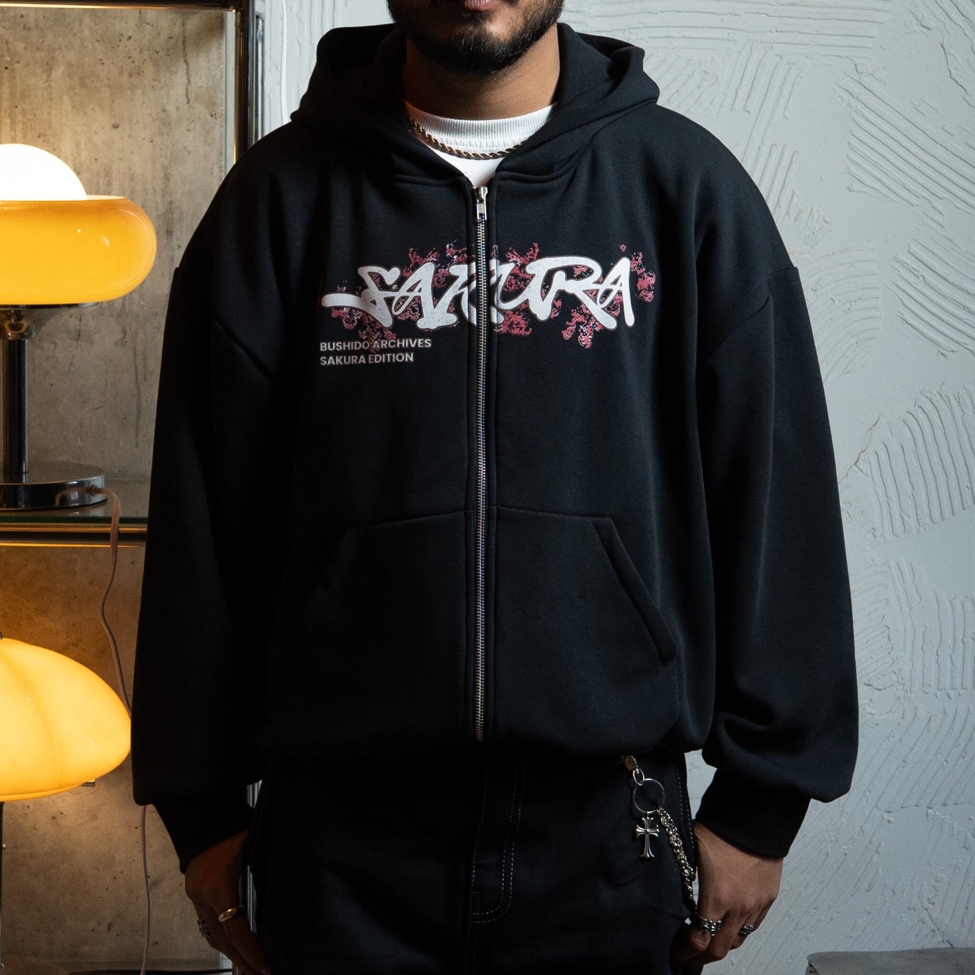 This Sakura zip-up Hoodie is designed with a sakura tree print, featuring a boxy cropped fit, with soft feel. Made from a premium 420GSM polycotton fleece (70% cotton, 30% polyester), the hoodie delivers warmth, durability, and softness—perfect for cooler days or layered looks.